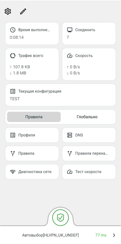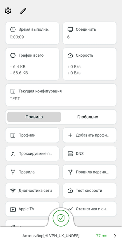 Если вы создали профиль (или несколько), содержащий несколько ключей (серверов), и протестировали их, то Karing будет автоматически выбирать сервер с наименьшей задержкой. Если сервер выбран, вручную или автоматически, и подключён – то длительное нажатие на главной странице на величину задержки (77 ms на скриншоте), приведет к повторному тестированию, и вы увидите текущую величину.