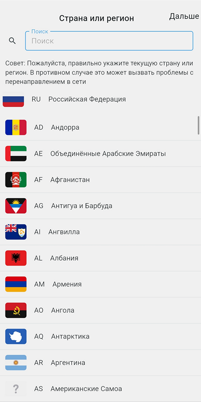 Следующий экран - выбор Страна или регион (Country or Region) - страны для автоматического применения правил перенаправления. Очень важно правильно выбрать свою страну, поскольку это определяет, какие соединения пойдут через прокси, а какие напрямую. В частности, если вы в России - при выборе ru - часть заблокированных сайтов и все иностранные пойдут через прокси и окажутся разблокированными, а не заблокированные российские пройдут напрямую, в обход прокси. Кроме того, предлагаемые вам в дальнейшем шаблоны Личных правил также зависят от выбора страны. Для выбора страны введите двухбуквенный код страны в поле поиска – например ru.