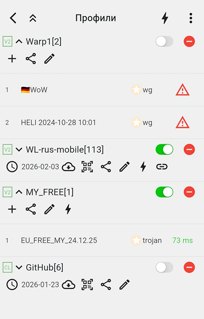 Ниже пример страницы профилей. Они могут отображаться как в развернутом, так и в компактном виде. Это регулируется значками в виде одинарной или сдвоенной галочки, направленной вверх или вниз. Включение или отключение профиля в целом – переключатели слева от профиля. Если переключатель зеленый – профиль (и все ключи в нем) включен. Красный круглый значок справа – удаление соответствующего профиля.