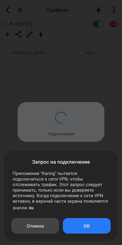 Если это первый запуск свежеустановленной программы, то при запуске теста или соединения вы получите на телефоне однократный запрос на разрешение доступа к VPN. (В Windows такого запроса нет). Это надо обязательно разрешить.