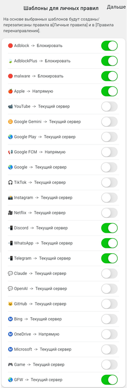 Это не сами правила, а именно преднастроенные шаблоны. Если вы выберете переключателем какую-то строку, то соответствующее правило будет в дальнейшем добавлено вам в ваш личный список правил. В дальнейшем вы сможете поменять у этого правила действие - блокировать, или направить напрямую, или направить в прокси. А также отредактировать или переместить добавленное правило.