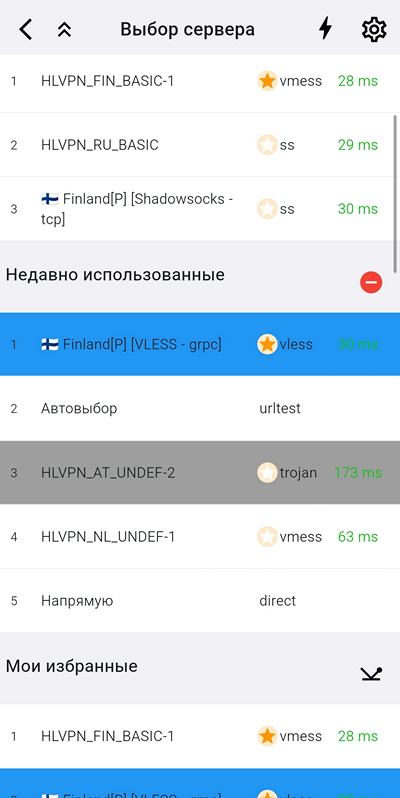 Короткий тап по серверу назначит его использующимся и отключит автовыбор.