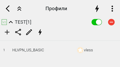 Тестирование профилей – значок в виде молнии. Протестированный профиль выведет справа зеленые цифры задержки напротив конкретного сервера, или значок недоступности в виде красного треугольника с восклицательным знаком.