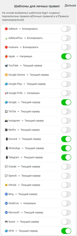 Таким образом, будет создан алгоритм обработки этой категории трафика. Например, можно заблокировать часть рекламы. Или пустить весь трафик Телеграма через определенный прокси. Разумеется, к этой настройке можно вернуться позже. При первой настройке приложения используйте как можно меньше правил. Настоятельно советую, как минимум, согласиться с выбором правил по умолчанию. Особенно важно выбрать правило GFW – Greate FireWall. Это оно отвечает за правильное перенаправление блокированного контента.
