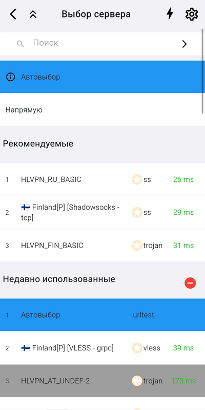 Однако автовыбор не всегда удобен. Тогда нужное вам поведение и нужный сервер вы настраиваете вручную. Для этого тапните на главном экране слева внизу на полоску с надписью Автовыбор.