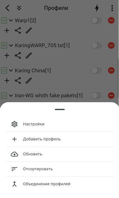 Строки в подменю сверху вниз – Настройки, Добавить профиль, Обновить (Синхронизировать подписку, если профиль является подпиской), Отсортировать, Объединение профилей: