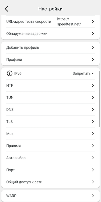 WARP – если у вас есть работающая лицензия для подключения к WARP, то тут можно её ввести для совместного использования Karing и WARP.