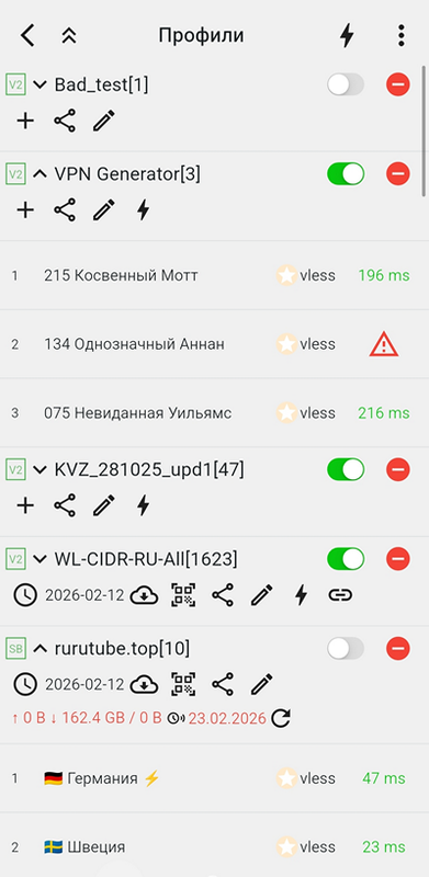 В случае, если профиль является подпиской, помимо описанного добавлены дополнительные действия и информация. Слева указано время последней синхронизации подписки, затем знак принудительной синхронизации в виде облака, затем знак экспорта строки подписки в QR-код. Остальное – как выше описано.