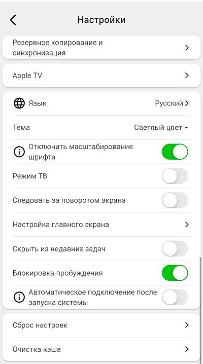 Список параметров настройки занимает четыре экрана (показано на Android). Основные настройки описаны ниже.