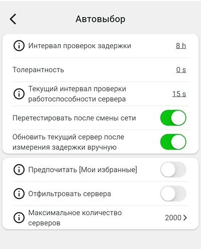 Автовыбор — настройки проверок доступности серверов, а также работоспособности текущего сервера. На экране — настройки по умолчанию. Советую поставить как на картинке и больше их не трогать.