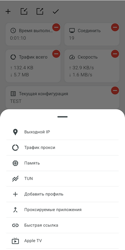 Большинство действий, выполняемых виджетами, доступны также из Главного меню настроек (шестеренка), но не все. Будьте внимательны, чтобы не удалить здесь нужное – например, тест Диагностика сети, или Соединения. Их нет в Главном меню. Также советую добавить на экран виджеты Выходной IP и Онлайн-панель.