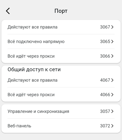Порт – это возможность увидеть, и при необходимости изменить порты, используемые программой. По умолчанию Karing использует для проксирования порт 3067. Также используются и другие порты. Эти порты используются при организации доступа из локальной сети. Порты для использования из локальной сети разделены от портов на устройстве с Karing.