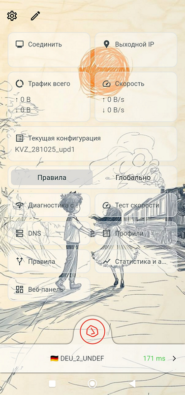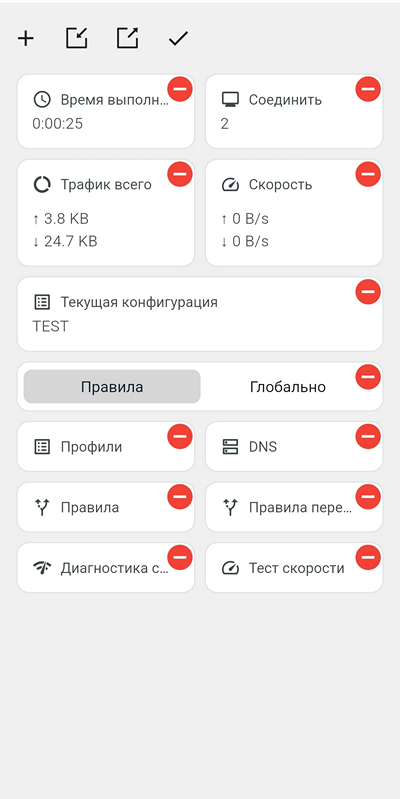 Все настройки программы выполняются при выключенном соединении. Значок настроек на главном экране в виде шестеренки. Начиная с версии 1.2.3.841, интерфейс на главном экране настраиваемый. Переход к настройке интерфейса – значок карандаша на главном экране. При первом запуске вы видите главный экран со всеми возможными виджетами: