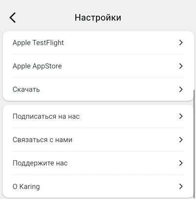 Это полезные ссылки — для обновления Karing и для связи c разработчиками и коммьюнити.