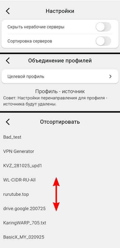 Помимо добавления, удаления и отключения профилей, профили можно объединять, и реорганизовывать – менять их порядок. Это делается через нажатие в окне Профили трёх точек вверху справа - всплывёт дополнительное меню.