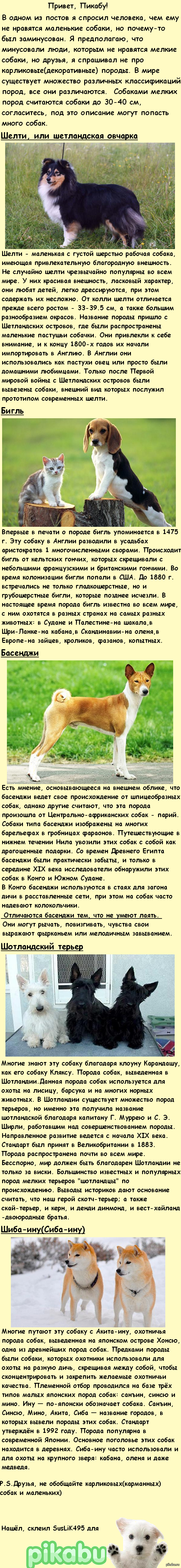 Собаки маленьких пород по размеру делятся на тоев (рост в холке до 28 см), карликов (до 35 см) и малых (до 45 см) .Породы маленьких собак имеют вес, который не превышает 10 кг, а наиболее популярные породы: тойтерьер, такса . . .