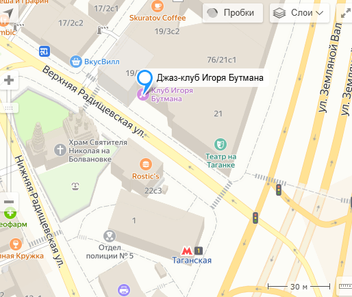 Джаз-клуб Игоря Бутмана расположился под одной крышей с Театром на Таганке. Прогуляйтесь вечером на Таганской, и вы услышите, как из динамиков звучит клуб. Заходите на огонек и звуки джаза. На сцене клуба Игоря Бутмана ежедневно выступают артисты и представляют новые произведения и знакомые всем, а также играют самый настоящий джаз. Среди гостей Сергей Мазаев, Валерий Сюткин, конечно, сам Игорь Бутман, а также много молодых исполнителей из МОсквы, регионов, а также зарубежные музыканты. Каждый день играет живая музыка, и она всегда интересная. На официальном сайте Джаз-клуба Игоря Бутмана ведется живая он-лайн трансляция концертов с этой площадки.