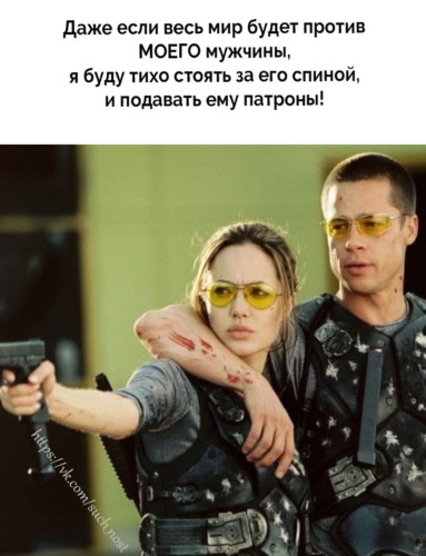 Скачать картинку . Текст на изображении: Даже если весь мир Будет против моего мужчины, Я буду тихо стоять за его спиной, И подавать ему патроны! Добавлено: 06 .03 .2015 . Код для размещения изображения