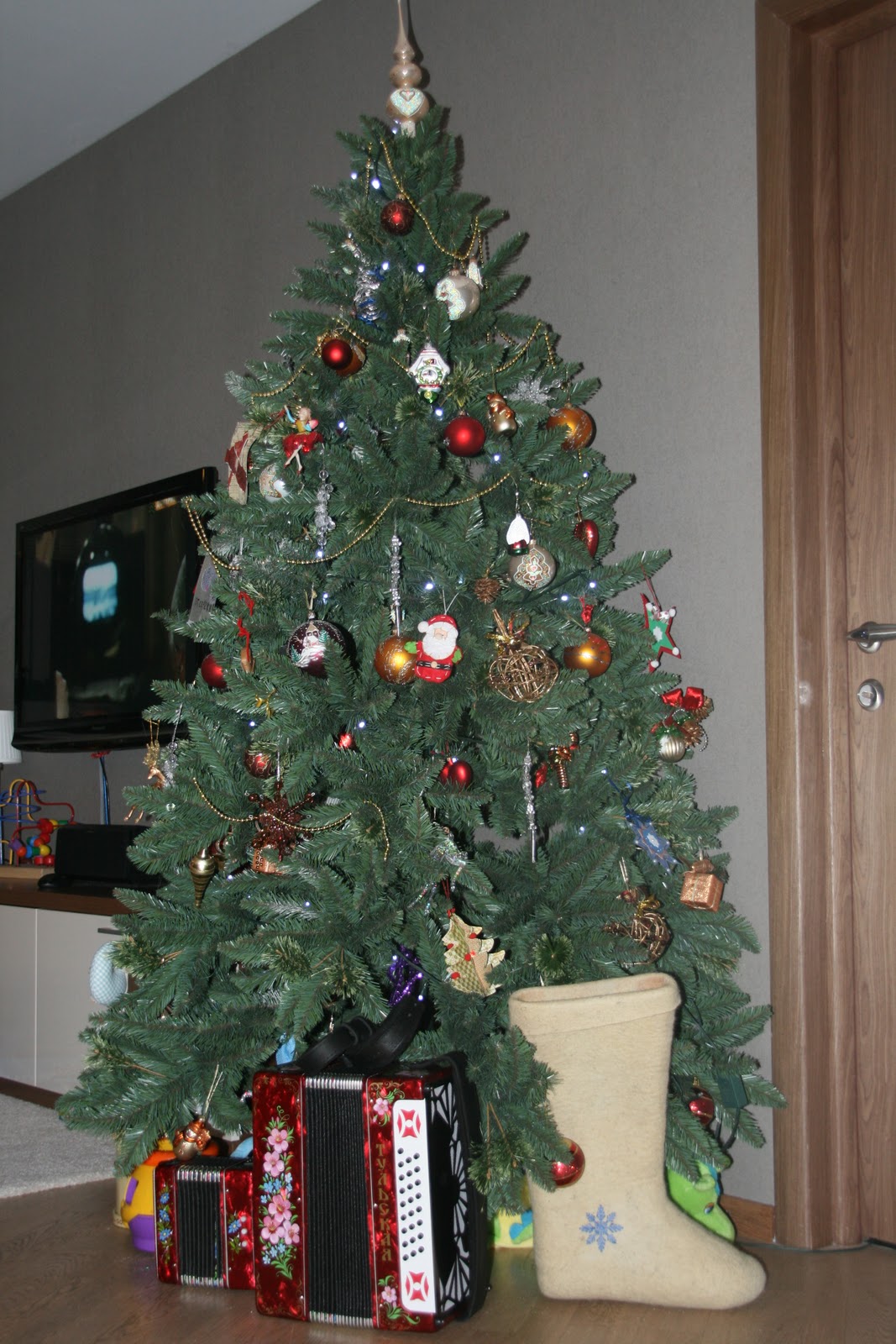 Сказочная картинка . Елочка и шарики для украшения . Новогодние медведи . Красно-золотое сочетание . Подарки, шарики . Елочные шары сделанные своими руками . Новогодняя атмосфера . Шкатулка с . . .