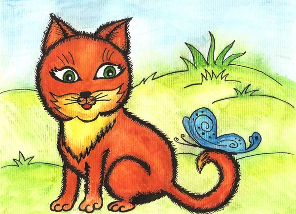 Рисунок красками . Картинка с рыжим котом . Срисовка для цветных карандашей . Рисунок рыжего кота на лужайке с цветами . Детский рисунок рыжего кота . Рыжая кошка для дошкольников .
