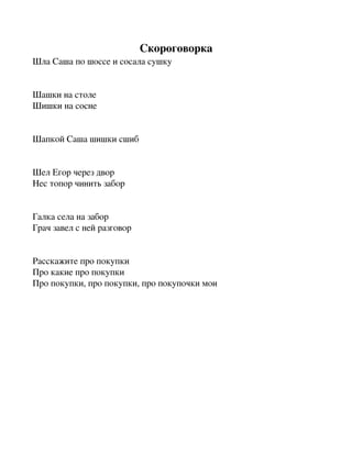 Произносить тексты: Сшила Саша Сашке шапку . Шла Саша по шоссе и сосала сушку и т .д . 5 . Скороговорки: Саша шапкой шишки сшиб, Получил на лбу ушиб . Шел Стас по шоссе К Саше в шашки играть .