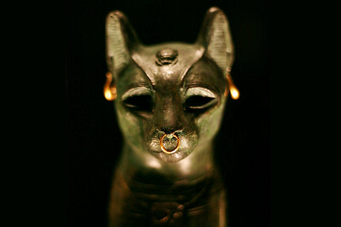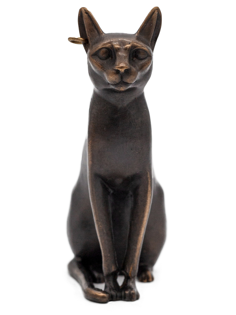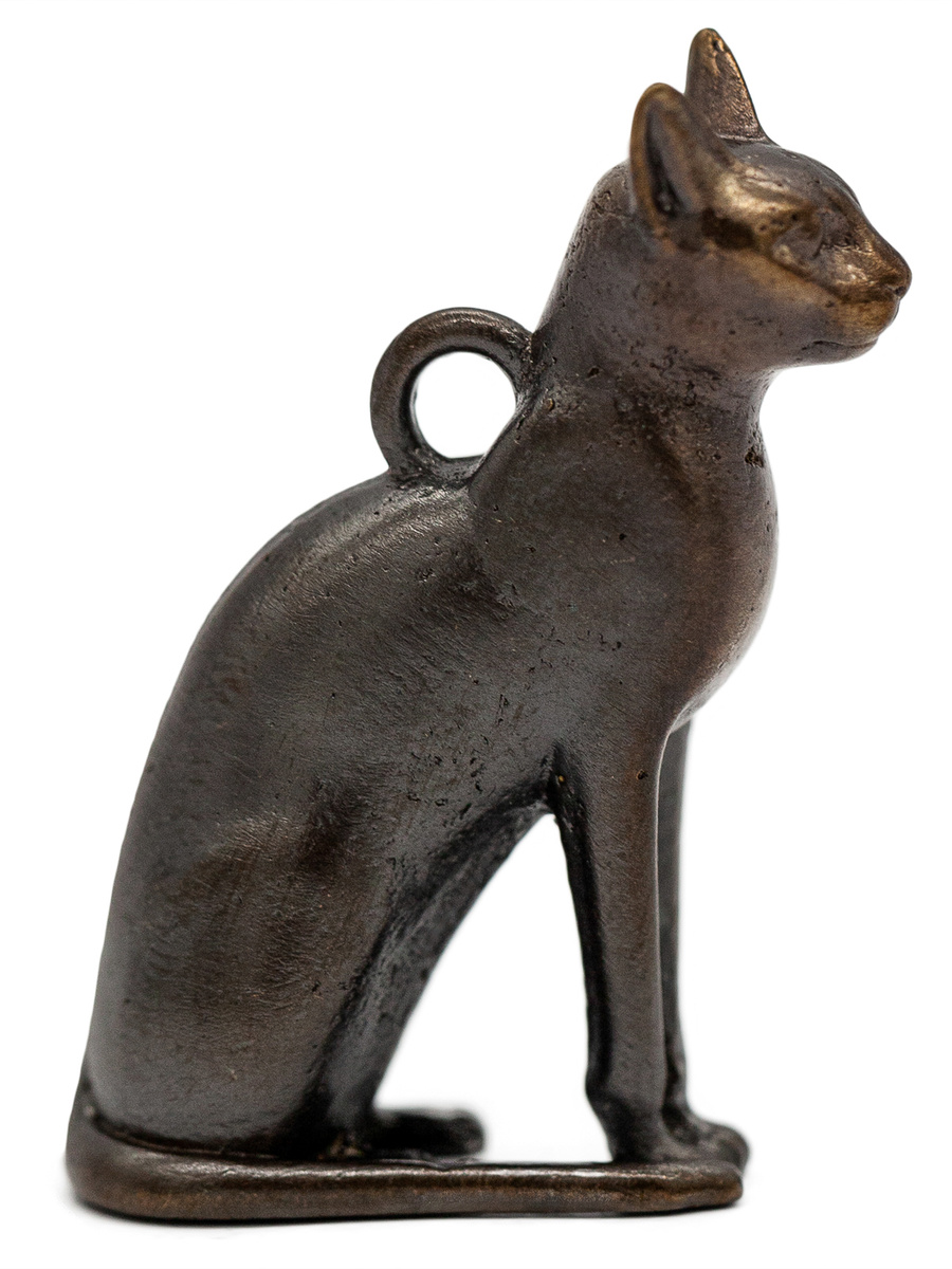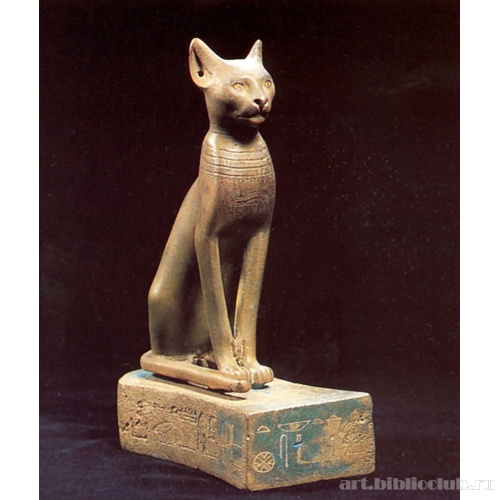 Статуэтка богини Бастет в образе кошки . Позднее царство, 26 династия, VII-VI вв . до н . э . Бастет - египетская богиня радости и веселья, изображавшаяся, по крайней мере, начиная со II тыс . до н . э ., в виде кошки, иногда с котятами, или женщины с кошачьей головой .