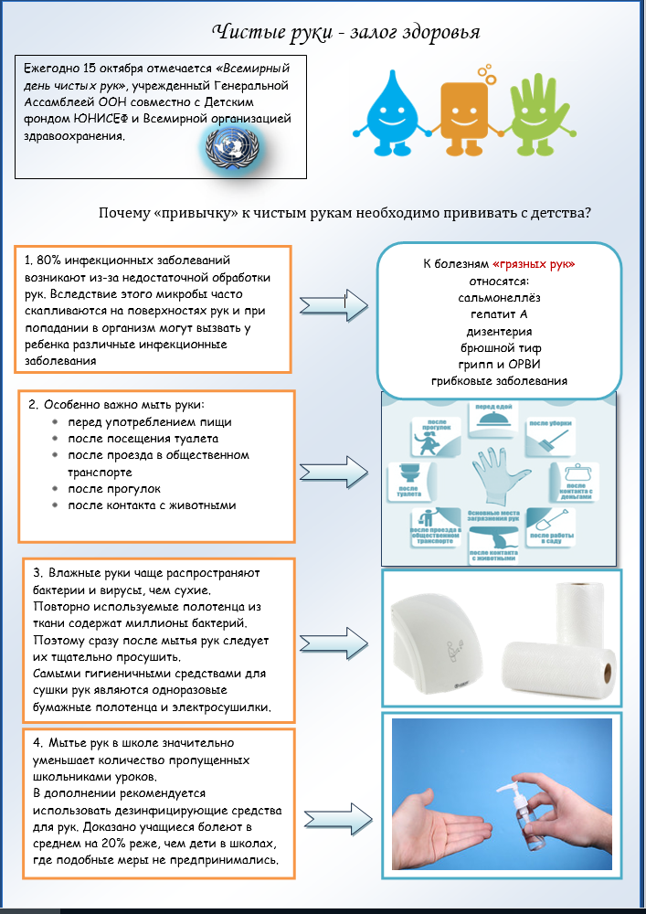 Чистые руки - залог здоровья . С 2008г . по решению Генеральной Ассамблеи ООН совместно с Детским фондом ЮНИСЕФ и Всемирной организацией здравоохранения 15 октября ежегодно проводится Всемирный день чистых рук . Символ . . .