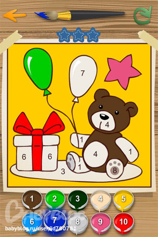 Нужные цвета выбираюйте на палитре левой кнопкой мыши . Можно раскрашивать каждую область отдельно по клику мыши или группу областей одновременно, проводя по ним курсором с нажатой левой кнопкой мыши . Для сохранения картинки щёлкните правой кнопкой мыши на холсте и . . .
