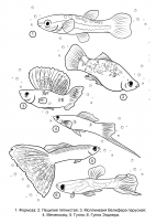 В ней собраны картинки аквариумных рыбок, цветные образцы и подпись с названием рыбки . На оригинал, плавающий в аквариуме, рыбки очень мало похожи, поэтому подпись очень необходима в данном случае . Конечно, понятно, что для детской раскраски делают упрощенно изображение . . .