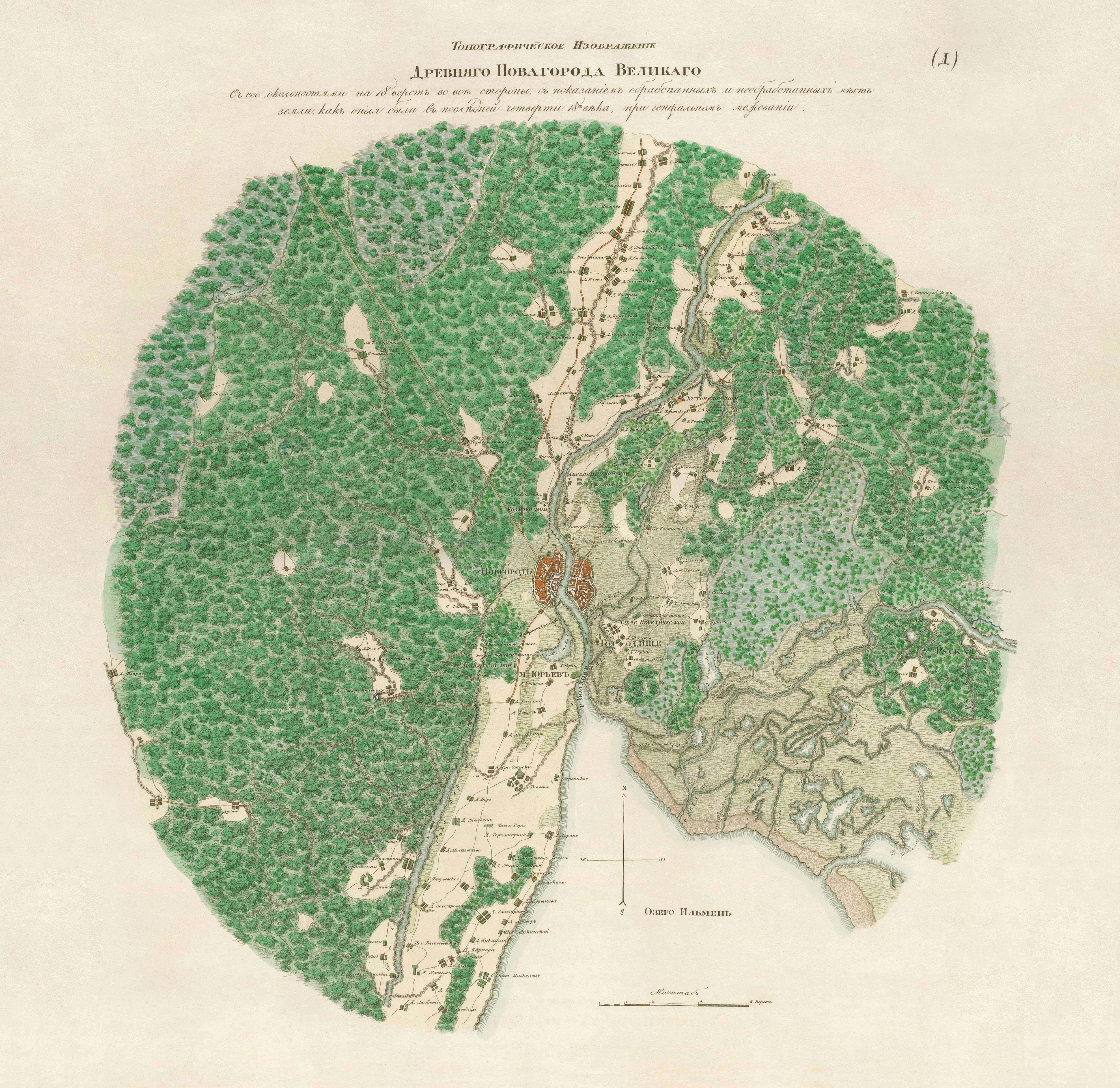 Топографическое изображение древнего Новгорода Великого с его окольностями . Цветная версия карты . Год: 1790 . Размер: 5000 x 4857 . Тип: картинка с картой . Скачать карту .