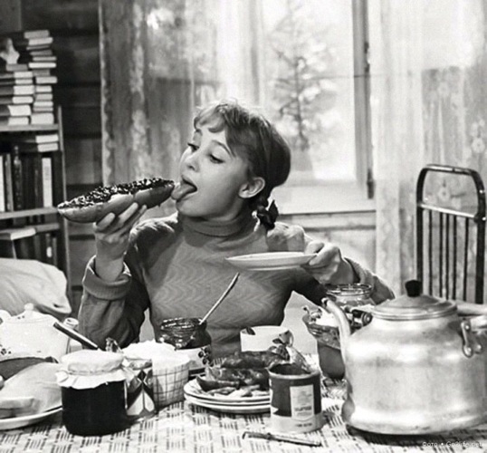Мужик ест красную икру ложкой . Смешная картинка про еду . Роллы очень вкусные . Собачка смотрит фильм . Обезьяна тоже кушать хочет . В каждой женщине ночью просыпается жрица .