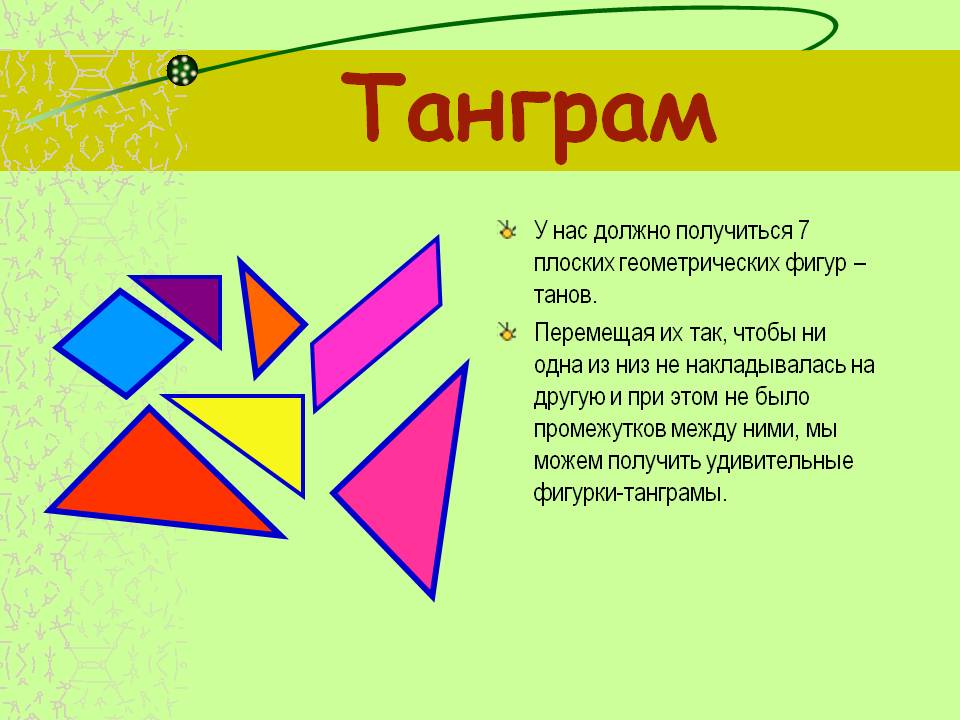 Переводят как «семь дощечек мастерства» или «узор из семи умных частей» . В Европе танграм изготавливали из дорогих пород дерева и слоновой Смежные фигурки должны примыкать друг к другу . Фигуры из танграма . Воспитатель может предложить детям любую тему игры с . . .