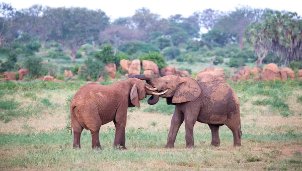 Семья красных слонов на водопое в середине саванны . . .