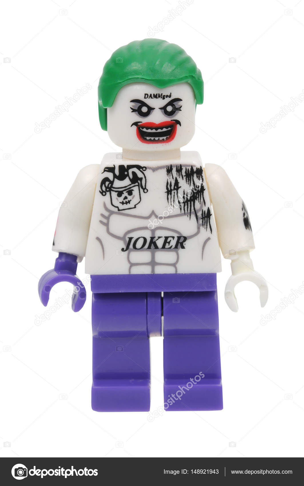 Лего фігурка Джокера . Дівчина переодяглася в образ Джокера . Сумний маніяк . Злий ворог Бетмена . Страшне обличчя маніяка Джокера . У Джокера в руці карта з джокером . Маніяк з радісним обличчям . Картинка з білою футболкою з Джокером . Клоун з відхиленнями . Джокер зі своєю картою . Злий клоун вбивця . Ворог Бетмена . Серійний маніяк вбивця .