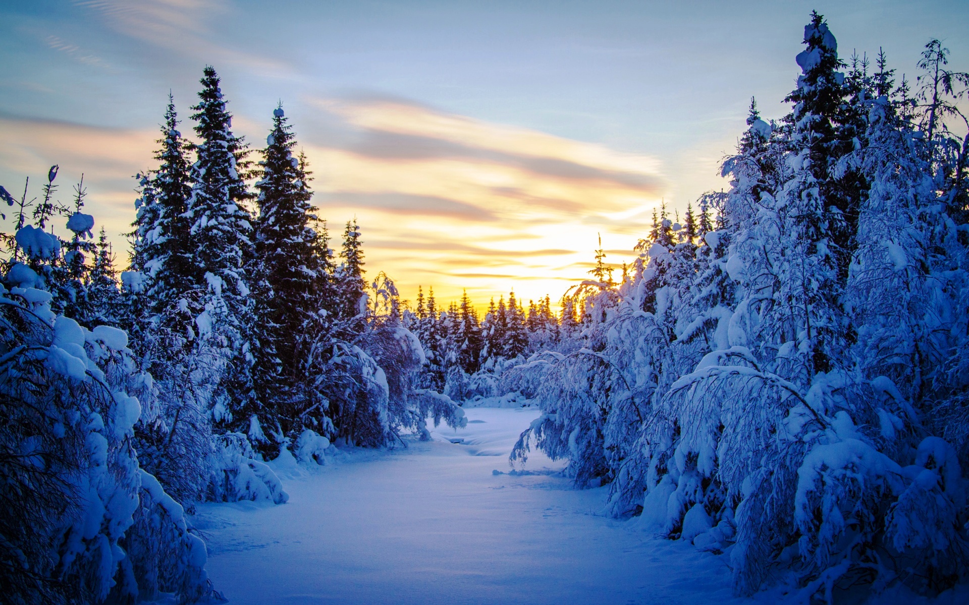 Березы в лесу зимой . Елки в зимнем лесу вечером . Воздух наполнен свежестью . Хрустящий снег лежит на земле . Высокие деревья на заднем плане . Речка посреди зимнего леса . Человек прошел через поле . Густой лес за городом . Восхитительная картинка зимнего леса . Солнце светит на растения . Прекрасный закат . Стена из вытянутых елей . Золотые краски в небе .