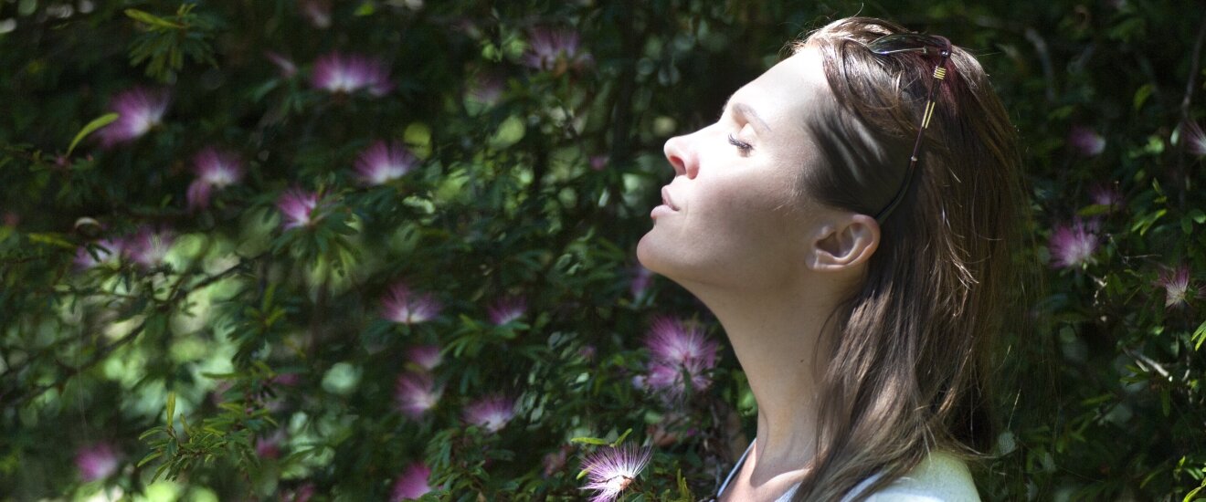 Молодая девушка стоит под лучами солнца . Правильные черты лица у девушки . Фото красивой девушки .
