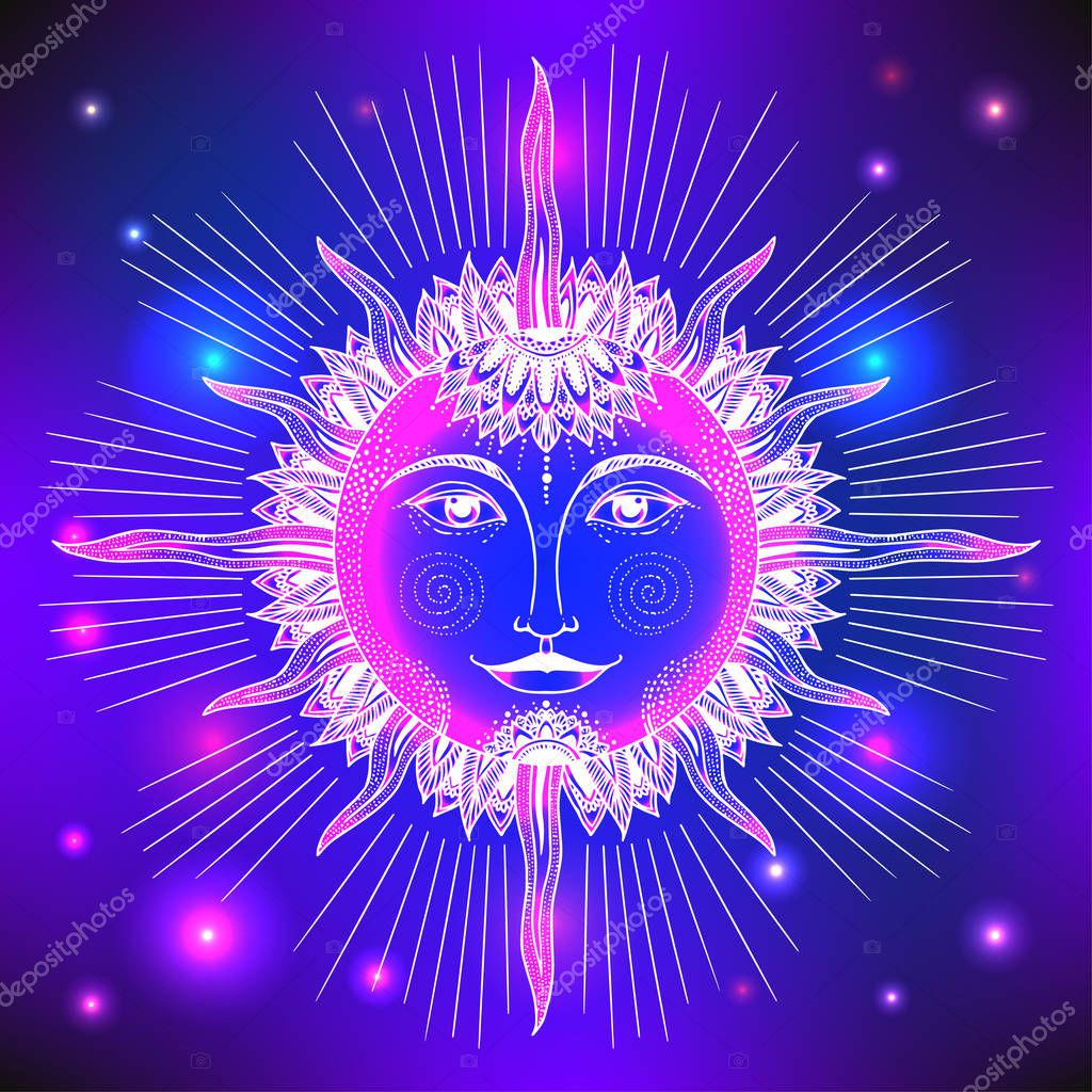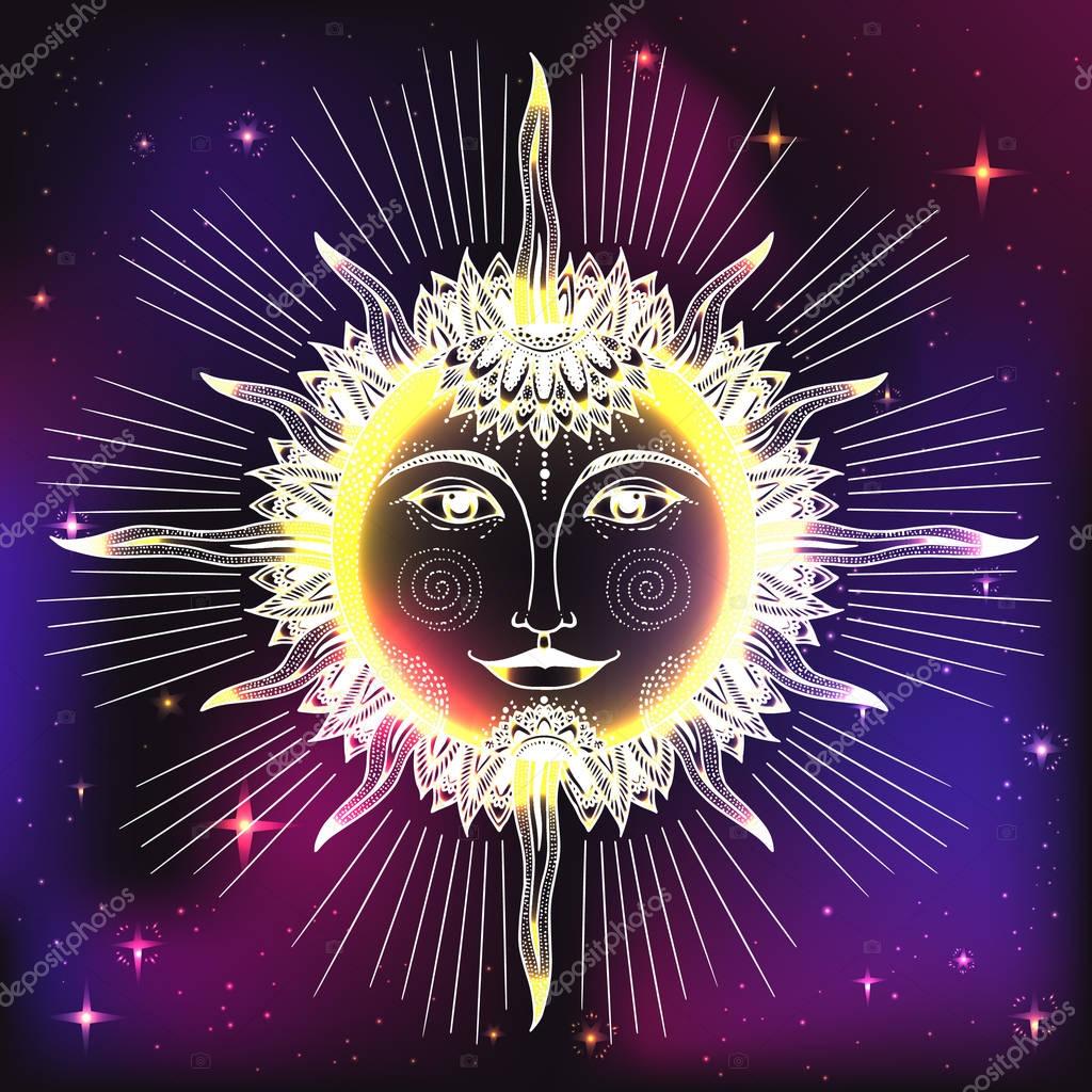 Счастливый декоративный коллаж из солнца и луны . Лицо солнца и луны, звезды, масонская татуировка, дизайн футболок, алхимия, акультизм, средневековая религия, ретро, духовность и изотерическая татуировка . пространство и звезды . векторные графики . Орел на фоне солнца .
