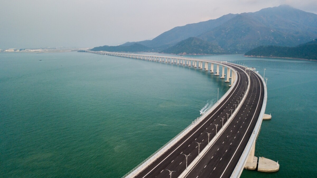 GrinPhoto Мост уходит в море . Автомобильный мост через реку идет к горизонту . Длинный мост уходит вдаль . Концепция - строительство дорог . Залив с бриллиантами на фоне голубого неба .