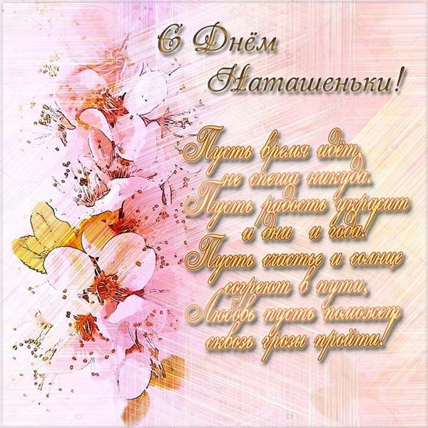 День ангела Натальи — поздравления в картинках С днем именин тебя, моя Наташа, Пускай беда тебя обходит стороной, Пусть ангел принесет на крыльях счастье, Пускай судьба удачей делится с тобой . Желаю сил тебе, здоровья, оптимизма, Пусть тебе светят лишь зеленые огни, Еще желаю счастья в личной жизни, Пусть ждут тебя прекраснейшие дни!