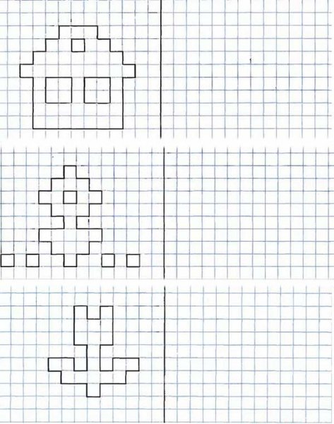 Срисуй по клеточкам для детей 6-7 лет . Рисунки по клеточкам для тети . Детские рисунки по клеточкам в тетради . Рисунки по клеточкам для дошкольников . Графические диктанты . Рисунки по клеточкам длямдетей . Домик по клеточкам для детей . Рисование по клеточкам для . . .