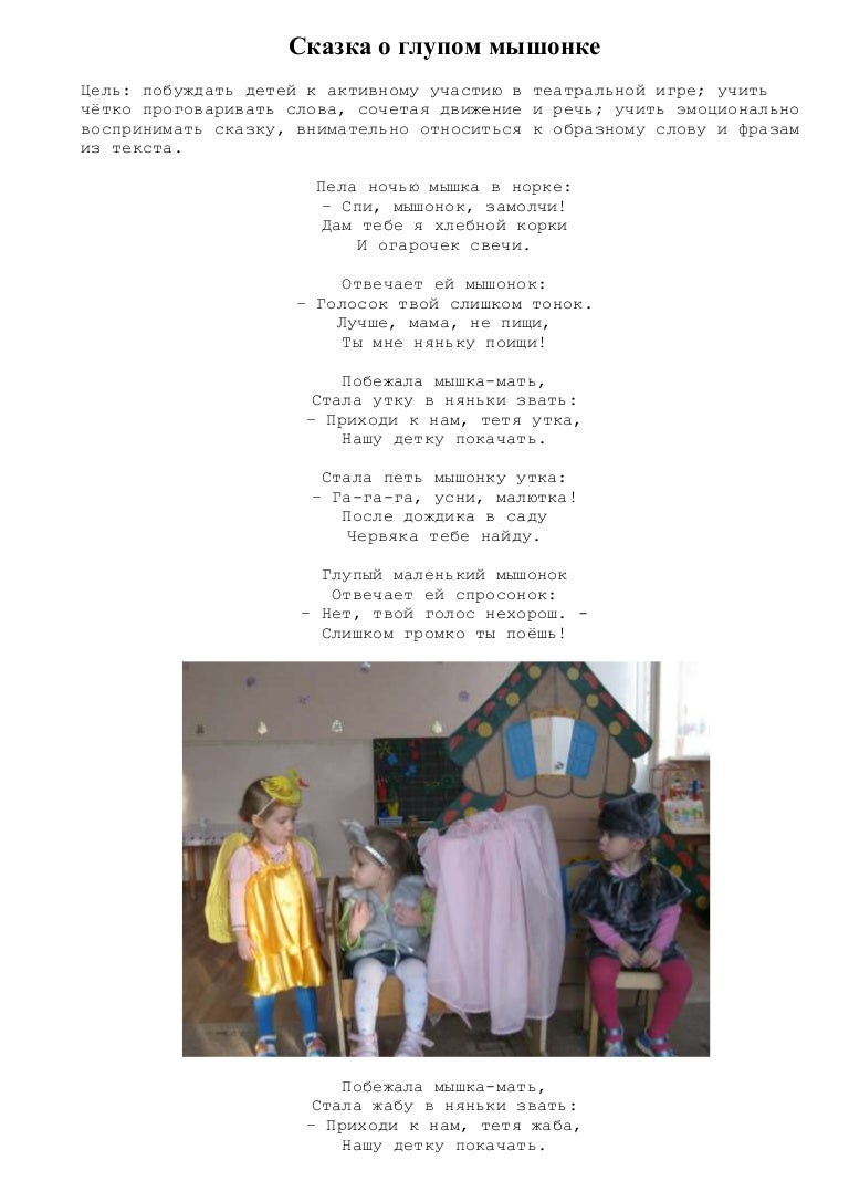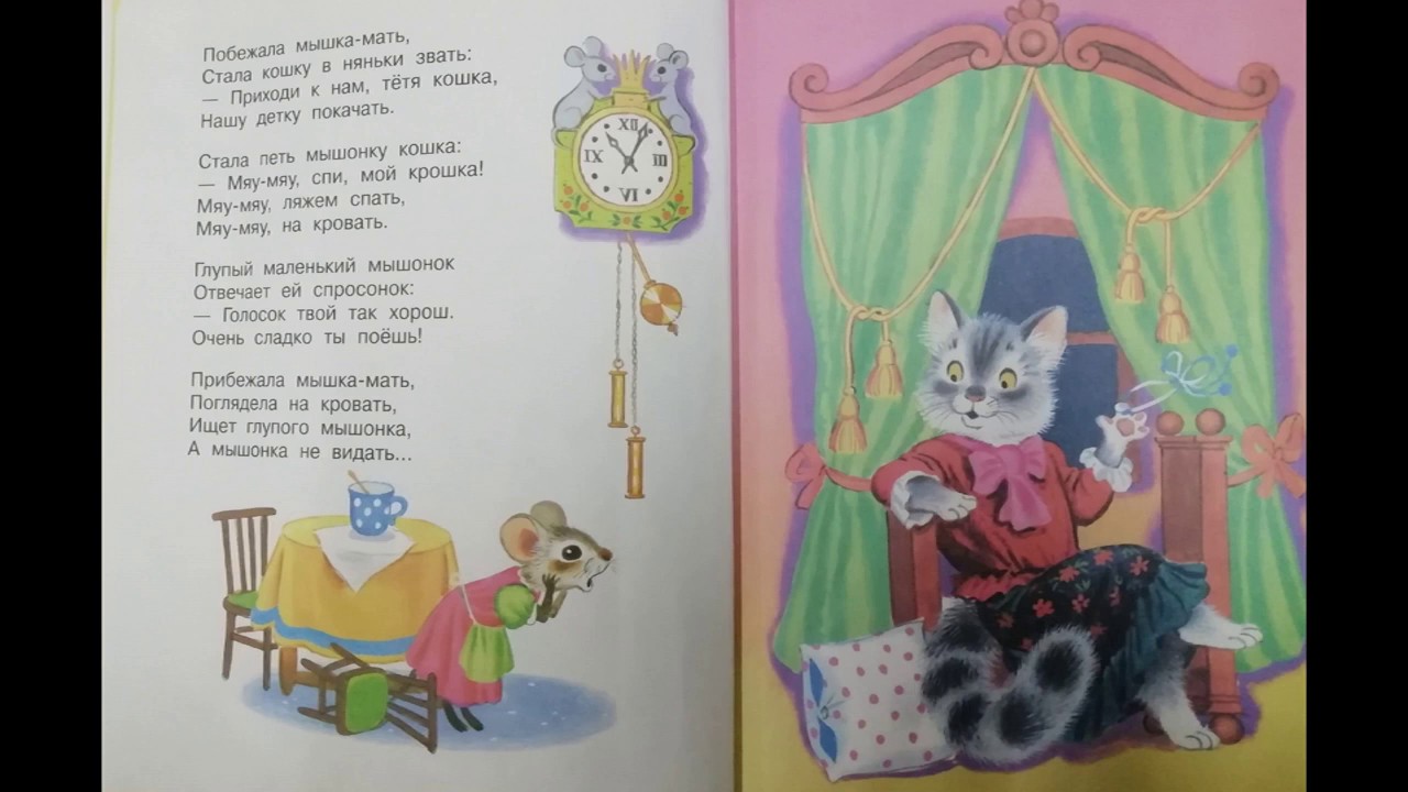 Прибежала мышка-мать, Поглядела на кровать, Ищет глупого мышонка, А мышонка не видать… Источник . Сказка о глупом мышонке — Самуил Маршак . Пела ночью мышка в норке: — Спи, мышонок, замолчи!