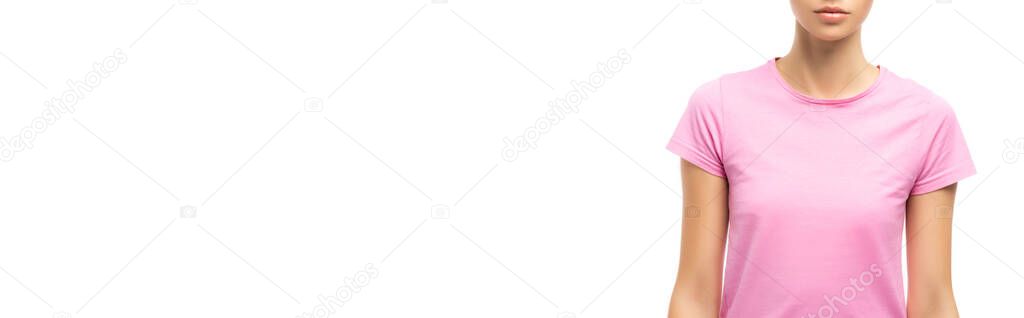 Женщина в пустой футболке с розовой лентой от рака . . .