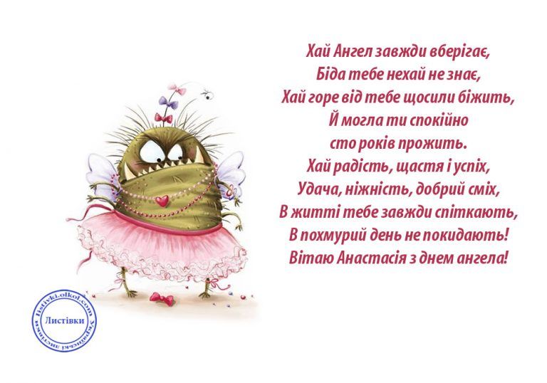 З Днем святої Анастасії Вітаю тебе, Настю! Нехай свята своєю силою Тебе рятує від напастей . Удача щоб була з тобою, І радість у домі щоб жила . Обдарує хай легкою долею Тебе заступниця твоя! *** В день святой Анастасии Видео дня Поздравления прими! Ангел твой с тобою рядом, Бережет судьбы пути . Тебе, Настя, помогает Мудрость и добро нести .