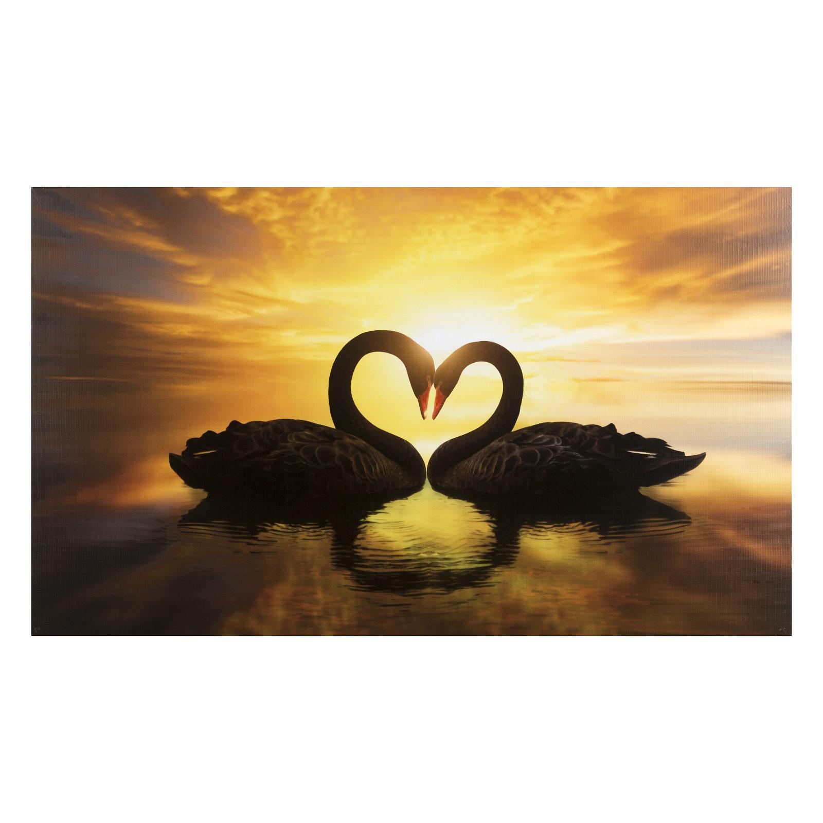 Блестящая картинка про любовь с парой лебедей в золотистом закате . Черный и белый лебеди на сочном ярком фоне . Красивая демонстрация сочности чувств влюбленных . Она словно в свадебном платье, а он одет в черный фрак .