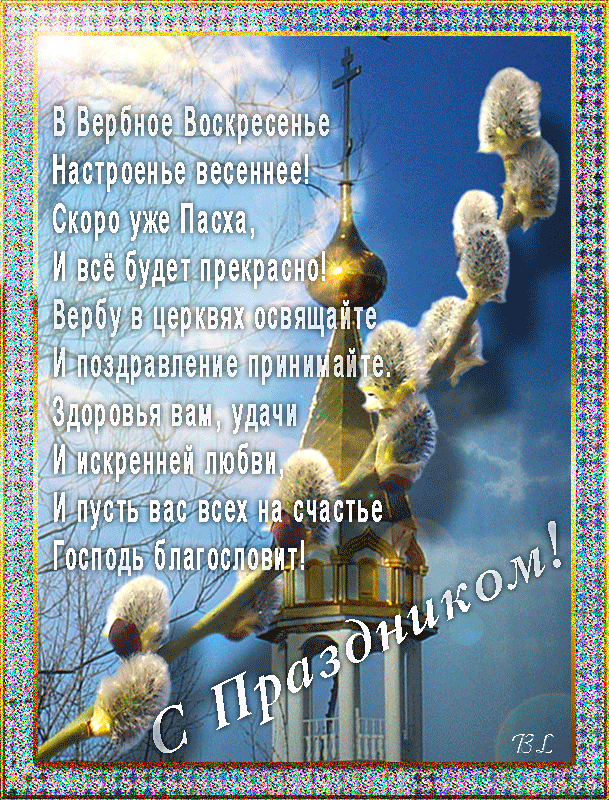 Открытки с Вербным Воскресеньем (336) GIF анимации и блестящие картинки-открытки в дни празднования Вербного Воскресенья . Вербное Воскресенье отмечают в последнее воскресенье перед Пасхой, веточки вербы в этот день освящают в церкви .
