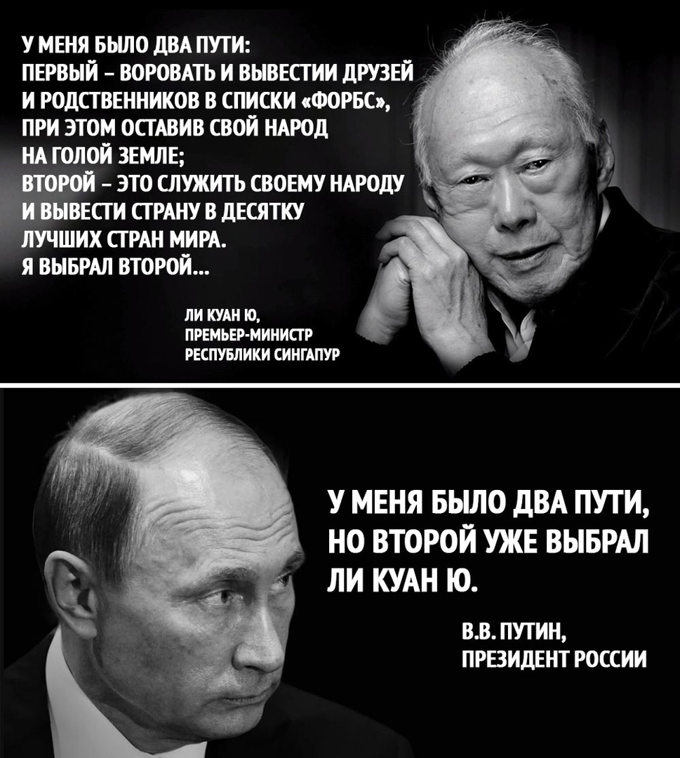 У меня было два пути, но второй уже выбрал Ли Куан Ю . (с) В . В . Путин . Нет пути . Ровно до тех пор, пока сознание коллективное не сменит вектор потихоньку . А вообще-то я картинки смотреть пришёл, а не вот это все .