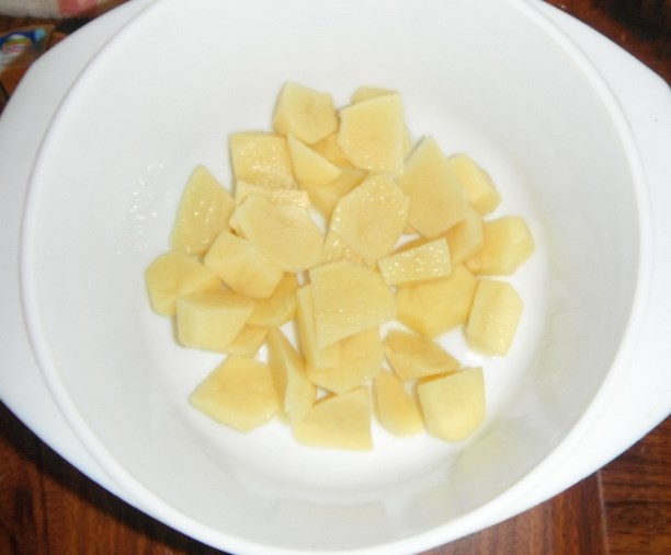 Картошка, запеченная в микроволновке под сыром . В этом рецепте вместо приправы я использую сыр . У меня не было под рукой тёрки, по этому я порезал сыр на мелкие кусочки . Картошку также почистить, порезать ломтиками . Затем добавить соли и перемешать .