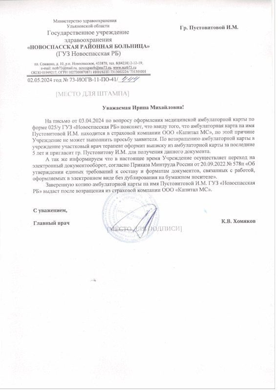 Копия медицинской карты. Более того, в течение 2024 года Пустовитова И. М. неоднократно обращалась к главному врачу ГУЗ «Новоспасская РБ» К. В. Хомякову с заявлениями о выдаче заверенной в установленном порядке главным врачом ГУЗ «Новоспасская РБ», либо уполномоченным им должностным лицом, копии Карты, либо о выдаче оригинала Карты. 07 августа 2024 г. в приемной главного врача ГУЗ «Новоспасская РБ» заведующая поликлиникой ГУЗ «Новоспасская РБ» Г. С. Гафурова вместо заверенной в установленном порядке главным врачом ГУЗ «Новоспасская РБ» Хомяковым К. В. копии Карты выдала Пустовитовой И. М. пачку бумаги, состоящую из 32 листов формата А4, содержащих информацию из Карты за период получения Пустовитовой И. М. медицинской помощи в ГУЗ «Новоспасская РБ» с июня 2015 года июнь 2024 года. 28 октября 2024 г. в приемной главного врача ГУЗ «Новоспасская РБ» Пустовитова И. М. получила копию Карты, состоящую из 225 листов формата А4, заверенную главным врачом ГУЗ «Новоспасская РБ» К. В. Хомяковым. Однако при изучении полученной в приемной главного врача ГУЗ «Новоспасская РБ» копии Карты, Пустовитовой И. М. установлено, что полученная ею в приемной главного врача ГУЗ «Новоспасская РБ» копия Карты содержит информацию о получении ею медицинской помощи в ГУЗ «Новоспасская РБ» в неполном объеме. Более того, в копии Карты многие копии записей об обращениях Пустовитовой И. М. за медицинской помощью в ГУЗ «Новоспасская РБ» дублируют друг друга и (или) следуют не в хронологическом порядке. На многих копиях записей об обращениях Пустовитвой И. М. за медицинской помощью в ГУЗ «Новоспасская РБ» присутствует непонятная чернота. Многие копии записей об обращениях Пустовитовой И. М. за медицинской помощью в ГУЗ «Новоспасская РБ» оформлены таким образом, что содержащуюся на этих листах информацию прочесть невозможно. 09 декабря 2024 г. в приемной главного врача ГУЗ «Новоспасская РБ» Пустовитова И. М. получила очередную копию Карты, состоящую из 257 листов формата А4, заверенную главным врачом ГУЗ «Новоспасская РБ» К. В. Хомяковым. Однако при изучении полученной в приемной главного врача ГУЗ «Новоспасская РБ» копии Карты, Пустовитовой И. М. установлено, что полученная ею в приемной главного врача ГУЗ «Новоспасская РБ» копия Карты снова содержит информацию о получении ею медицинской помощи в ГУЗ «Новоспасская РБ» в неполном объеме. Например, в копии Карты отсутствует копия выписного эпикриза из ГУЗ УОКБ, согласно которому Пустовитова И. М. находилась на стационарном лечении в гастроэнтерологическом отделении ГУЗ УОКБ в период с 08 по 24 декабря 2010г. В копии Карты отсутствуют копии многих протоколов компьютерной томографии (например, копия протокола КТ № 031898 от 13.06.2024), а также копии многих других важных протоколов (например, протокола эхографического исследования от 15.03.2024). Более того, в копии Карты отсутствуют копии многих записей об обращениях Пустовитовой И. М. за медицинской помощью в ГУЗ «Новоспасская РБ». Например, отсутствует копия записи о том, что Пустовитова И. М. была на приеме у врача-кардиолога в ГУЗ «Новоспасская РБ» 01 апреля 2024 г. В копии Карты многие копии записей об обращениях Пустовитовой И. М. за медицинской помощью в ГУЗ «Новоспасская РБ» следуют не в хронологическом порядке. На копиях записей об обращениях Пустовитовой И. М. за медицинской помощью в ГУЗ «Новоспа