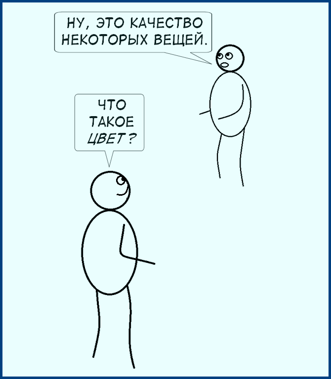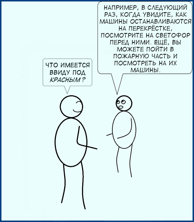 Красный. Абстрагируется свойство, которое разделяют рубины, розы, спелые помидоры, грудное оперение малиновки, сырая говядина и губные помады, и это слово выражает эту абстракцию.