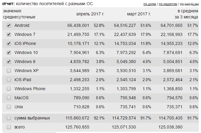 количество посетителей с разными ОС